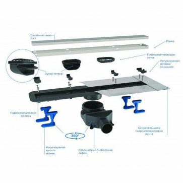 Душевой лоток AZARIO 600 мм, D40(50), 360°, металлическая перфорированная решетка, металлический желоб, комбинированный затвор (AZT3FT01600)